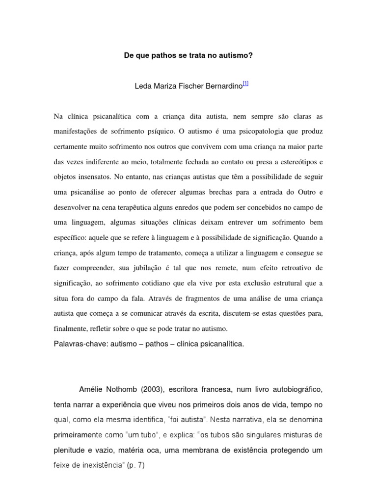 Na clnica psicanaltica com a criana dita autista, nem sempre so claras as manifestaes de sofrimento psquico. O autismo uma psicopatologia que produz certamente muito sofrimento nos outros que convivem com uma criana na maior parte das vezes indiferente ao meio, totalmente fechada ao contato ou presa a esteretipos e objetos insensatos. No entanto, nas crianas autistas que tm a possibilidade de seguir uma psicanlise ao ponto de oferecer algumas brechas para a entrada do Outro e desenvolver na cena teraputica alguns enredos que podem ser concebidos no campo de uma linguagem, algumas situaes clnicas deixam entrever um sofrimento bem especfico: aquele que se refere linguagem e possibilidade de significao. Quando a criana, aps algum tempo de tratamento, comea a utilizar a linguagem e consegue se fazer compreender, sua jubilao tal que nos remete, num efeito retroativo de significao, ao sofrimento cotidiano que ela vive por esta excluso estrutural que a situa fora do campo da fala. Atravs de fragmentos de uma anlise de uma criana autista que comea a se comunicar atravs da escrita, discutem-se estas questes para, finalmente, refletir sobre o que se pode tratar no autismo. Palavras-chave: autismo pathos clnica psicanaltica.