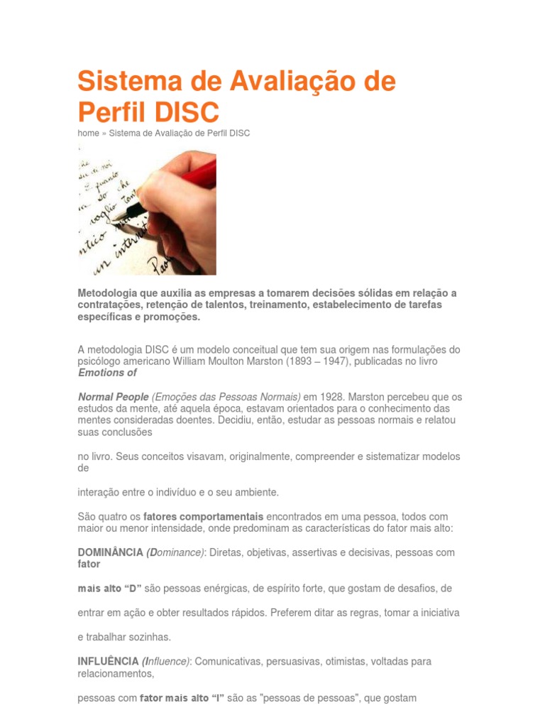 Metodologia que auxilia as empresas a tomarem decises slidas em relao a contrataes, reteno de talentos, treinamento, estabelecimento de tarefas especficas e promoes. A metodologia DISC um modelo conceitual que tem sua origem nas formulaes do psiclogo americano William Moulton Marston (1893 1947), publicadas no livro Emotions of Normal People (Emoes das Pessoas Normais) em 1928. Marston percebeu que os estudos da mente, at aquela poca, estavam orientados para o conhecimento das mentes consideradas doentes. Decidiu, ento, estudar as pessoas normais e relatou suas concluses no livro. Seus conceitos visavam, originalmente, compreender e sistematizar modelos de interao entre o indivduo e o seu ambiente. So quatro os fatores comportamentais encontrados em uma pessoa, todos com maior ou menor intensidade, onde predominam as caractersticas do fator mais alto: DOMINNCIA (Dominance): Diretas, objetivas, assertivas e decisivas, pessoas com fator mais alto D so pessoas enrgicas, de esprito forte, que gostam de desafios, de entrar em ao e obter resultados rpidos. Preferem ditar as regras, tomar a iniciativa e trabalhar sozinhas. INFLUNCIA (Influence): Comunicativas, persuasivas, otimistas, voltadas para relacionamentos, pessoas com fator mais alto I so as "pessoas de pessoas", que gostam