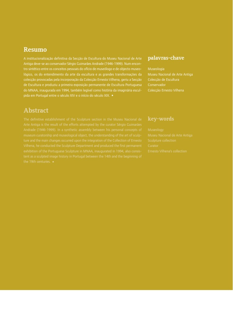 The definitive establishment of the Sculpture section in the Museu Nacional de Arte Antiga is the result of the efforts attempted by the curator Sérgio Guimarães Andrade (1946-1999). In a synthetic assembly between his personal concepts of museum curatorship and museological object, the understanding of the art of sculp- ture and the main changes occurred upon the integration of the Collection of Ernesto Vilhena, he conducted the Sculpture Department and produced the first permanent exhibition of the Portuguese Sculpture in MNAA, inaugurated in 1994, also consis- tent as a sculpted image history in Portugal between the 14th and the beginning of the 19th centuries. •