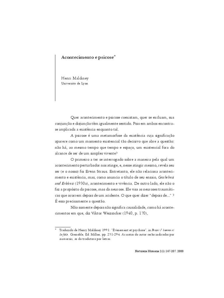 Traduzido de Henry Maldiney 1991: vnement et psychose, in Penser l homme et la folie. Grenoble, Ed. Millon, pp. 251-294. As notas do autor sero indicadas por numerais, as da tradutora por letras.