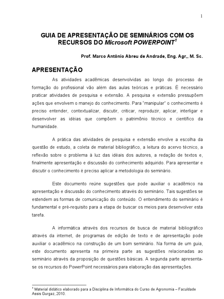 através da internet, de programas de edição de texto e de apresentação pode auxiliar o acadêmico na construção de um bom seminário. Na forma de um guia, este documento apresenta na primeira parte as sugestões relacionadas ao seminário através da proposição de questões básicas. A segunda parte apresenta- se os recursos do PowerPoint necessários para elaboração das apresentações.