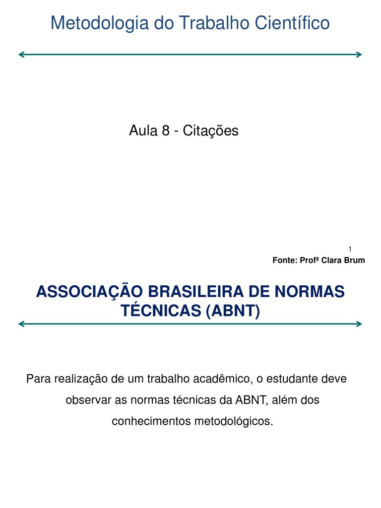 Para realizao de um trabalho acadmico, o estudante deve observar as normas tcnicas da ABNT, alm dos conhecimentos h i t metodolgicos. t d l i