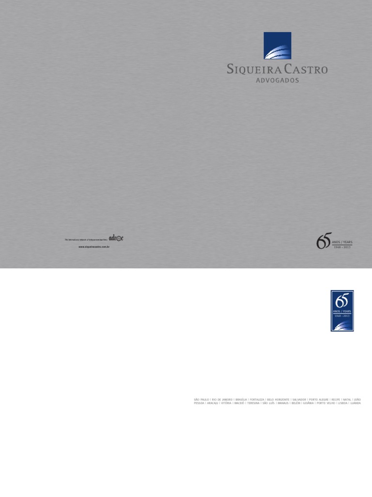 Nas pginas seguintes, voc conhecer um pouco de nossa histria, dos valores ticos e profissionais que abraamos e dos servios jurdicos prestados pelas diversas unidades do nosso Escritrio, no Brasil e no exterior. Nesses 65 anos de atuao da Siqueira Castro Advogados, procuramos construir uma empresa de advocacia slida, respeitada, eficiente, moderna e dinmica, pautada nos princpios da dignidade profissional, da lealdade e parceria com nossos clientes, do pioneirismo e da responsabilidade social. Nosso foco e objetivos permanentes so retribuir a confiana de nossos clientes de forma personalizada e buscar continuamente os resultados por eles almejados. Nosso maior ativo o conceito nacional e internacional conquistado pelo Escritrio, ao lado dos recursos humanos que formamos para, cada vez mais, atender da melhor forma aos nossos clientes e amigos em todos os setores de atividade econmica. Ser referncia no mercado da advocacia empresarial e satisfazer nossos clientes so a nossa maior recompensa. Ao longo dessas mais de seis dcadas, j percorremos um longo caminho de crescimento, de afirmao, de respeitabilidade e de xito. Sempre haver muito ainda por realizar. o que estamos determinados a fazer, com trabalho, entusiasmo, dedicao integral aos nossos clientes e criterioso e consequente planejamento, conscientes dos valores ticos e profissionais que norteiam nossas aes e nosso futuro. Este o nosso indesvivel compromisso. Agradecemos a todos os clientes, parceiros e amigos que, de alguma forma, tm nos ajudado a implementar nossos projetos e construir juntos nosso destino de grandeza e de realizaes recprocas. Carlos Roberto Siqueira Castro Scio Snior da Siqueira Castro Advogados