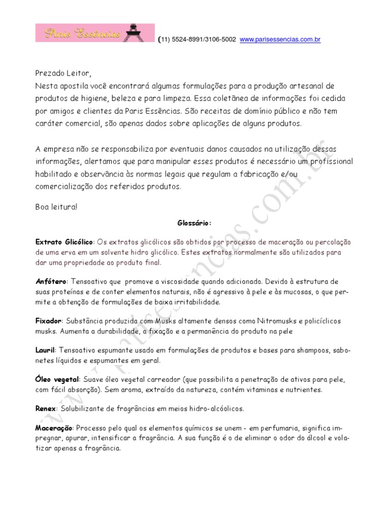 Prezado Leitor, Nesta apostila voc encontrar algumas formulaes para a produo artesanal de produtos de higiene, beleza e para limpeza. Essa coletnea de informaes foi cedida por amigos e clientes da Paris Essncias. So receitas de domnio pblico e no tem carter comercial, so apenas dados sobre aplicaes de alguns produtos. A empresa no se responsabiliza por eventuais danos causados na utilizao dessas informaes, alertamos que para manipular esses produtos necessrio um profissional habilitado e observncia s normas legais que regulam a fabricao e/ou comercializao dos referidos produtos. Boa leitura!