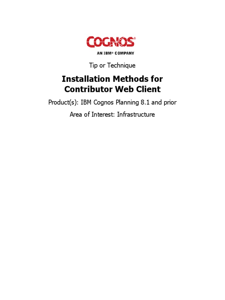 1.1 Purpose This document discusses the different alternative methods for installing the Contributor Web Client onto a users workstation. . Applicability IBM Cognos Planning Contributor 8.1 and prior Exclusions and Exceptions No exclusions identified