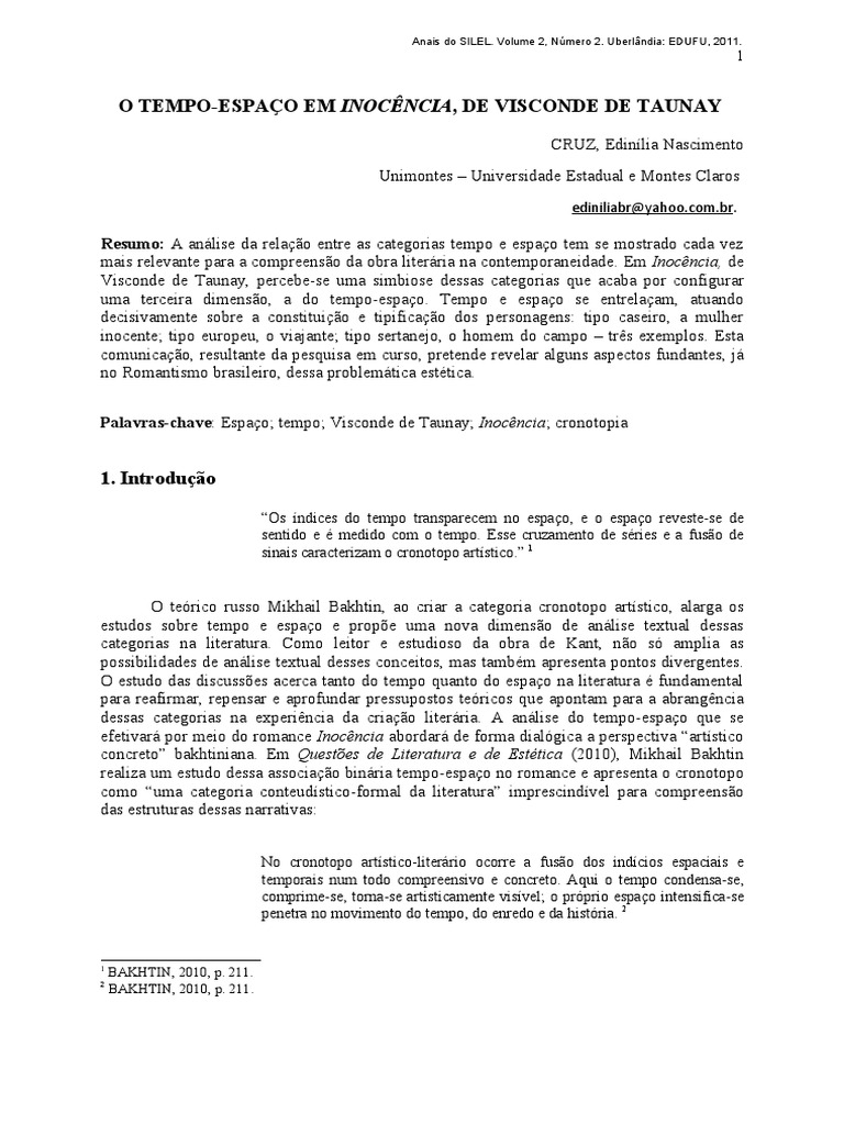 O teórico russo Mikhail Bakhtin, ao criar a categoria cronotopo artístico, alarga os estudos sobre tempo e espaço e propõe uma nova dimensão de análise textual dessas categorias na literatura. Como leitor e estudioso da obra de Kant, não só amplia as possibilidades de análise textual desses conceitos, mas também apresenta pontos divergentes. O estudo das discussões acerca tanto do tempo quanto do espaço na literatura é fundamental para reafirmar, repensar e aprofundar pressupostos teóricos que apontam para a abrangência dessas categorias na experiência da criação literária. A análise do tempo-espaço que se efetivará por meio do romance Inocência abordará de forma dialógica a perspectiva “artístico concreto” bakhtiniana. Em Questões de Literatura e de Estética (2010), Mikhail Bakhtin realiza um estudo dessa associação binária tempo-espaço no romance e apresenta o cronotopo como “uma categoria conteudístico-formal da literatura” imprescindível para compreensão das estruturas dessas narrativas: