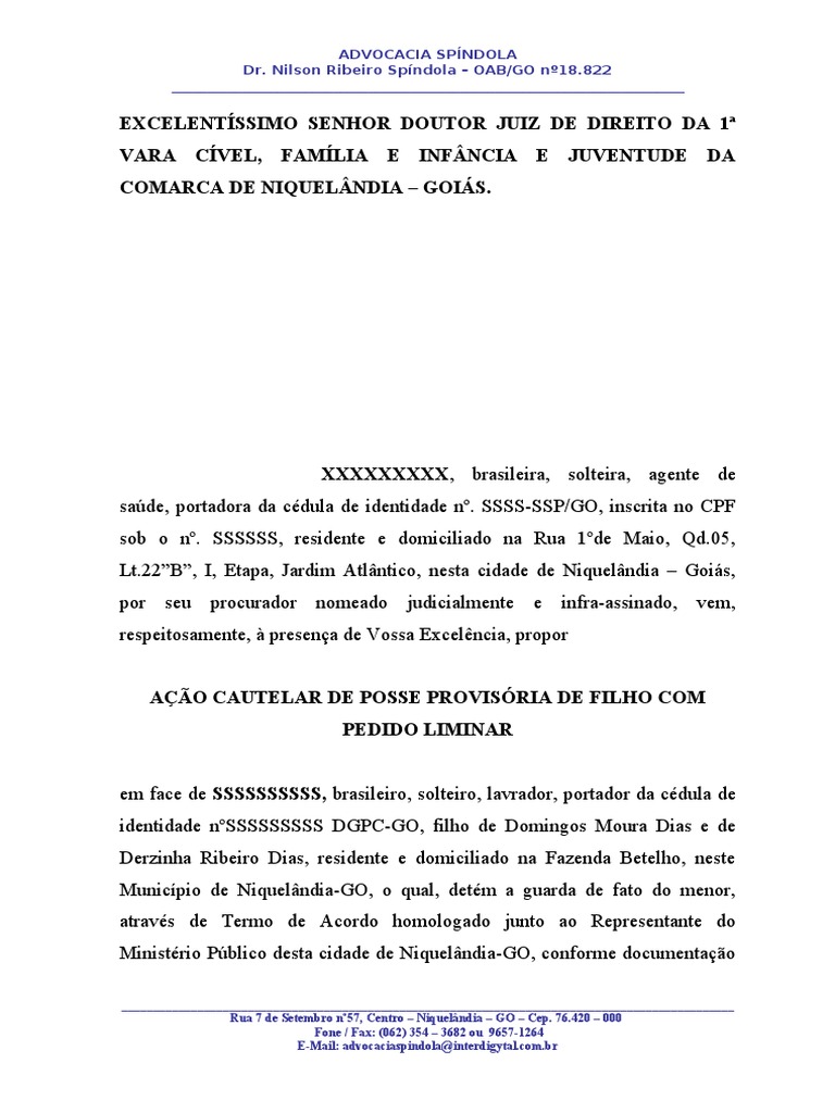 XXXXXXXXX, brasileira, solteira, agente de sade, portadora da cdula de identidade n. SSSS-SSP/GO, inscrita no CPF sob o n. SSSSSS, residente e domiciliado na Rua 1de Maio, Qd.05, Lt.22B, I, Etapa, Jardim Atlntico, nesta cidade de Niquelndia Gois, por seu procurador nomeado judicialmente e infra-assinado, vem, respeitosamente, presena de Vossa Excelncia, propor AO CAUTELAR DE POSSE PROVISRIA DE FILHO COM PEDIDO LIMINAR em face de SSSSSSSSSS, brasileiro, solteiro, lavrador, portador da cdula de identidade nSSSSSSSSS DGPC-GO, filho de Domingos Moura Dias e de Derzinha Ribeiro Dias, residente e domiciliado na Fazenda Betelho, neste Municpio de Niquelndia-GO, o qual, detm a guarda de fato do menor, atravs de Termo de Acordo homologado junto ao Representante do Ministrio Pblico desta cidade de Niquelndia-GO, conforme documentao