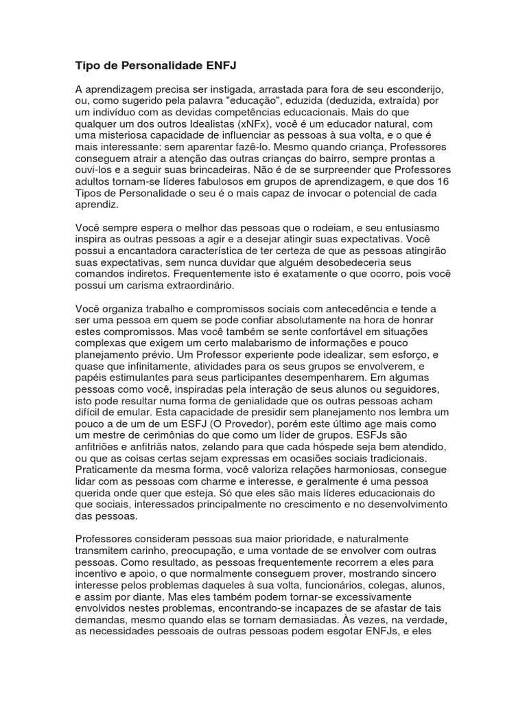 A aprendizagem precisa ser instigada, arrastada para fora de seu esconderijo, ou, como sugerido pela palavra "educao", eduzida (deduzida, extrada) por um indivduo com as devidas competncias educacionais. Mais do que qualquer um dos outros Idealistas (xNFx), voc um educador natural, com uma misteriosa capacidade de influenciar as pessoas sua volta, e o que mais interessante: sem aparentar faz-lo. Mesmo quando criana, Professores conseguem atrair a ateno das outras crianas do bairro, sempre prontas a ouvi-los e a seguir suas brincadeiras. No de se surpreender que Professores adultos tornam-se lderes fabulosos em grupos de aprendizagem, e que dos 16 Tipos de Personalidade o seu o mais capaz de invocar o potencial de cada aprendiz. Voc sempre espera o melhor das pessoas que o rodeiam, e seu entusiasmo inspira as outras pessoas a agir e a desejar atingir suas expectativas. Voc possui a encantadora caracterstica de ter certeza de que as pessoas atingiro suas expectativas, sem nunca duvidar que algum desobedeceria seus comandos indiretos. Frequentemente isto exatamente o que ocorro, pois voc possui um carisma extraordinrio. Voc organiza trabalho e compromissos sociais com antecedncia e tende a ser uma pessoa em quem se pode confiar absolutamente na hora de honrar estes compromissos. Mas voc tambm se sente confortvel em situaes complexas que exigem um certo malabarismo de informaes e pouco planejamento prvio. Um Professor experiente pode idealizar, sem esforo, e quase que infinitamente, atividades para os seus grupos se envolverem, e papis estimulantes para seus participantes desempenharem. Em algumas pessoas como voc, inspiradas pela interao de seus alunos ou seguidores, isto pode resultar numa forma de genialidade que os outras pessoas acham difcil de emular. Esta capacidade de presidir sem planejamento nos lembra um pouco a de um de um ESFJ (O Provedor), porm este ltimo age mais como um mestre de cerimnias do que como um lder de grupos. ESFJs so anfitries e anfitris natos, zelando para que cada hspede seja bem atendido, ou que as coisas certas sejam expressas em ocasies sociais tradicionais. Praticamente da mesma forma, voc valoriza relaes harmoniosas, consegue lidar com as pessoas com charme e interesse, e geralmente uma pessoa querida onde quer que esteja. S que eles so mais lderes educacionais do que sociais, interessados principalmente no crescimento e no desenvolvimento das pessoas. Professores consideram pessoas sua maior prioridade, e naturalmente transmitem carinho, preocupao, e uma vontade de se envolver com outras pessoas. Como resultado, as pessoas frequentemente recorrem a eles para incentivo e apoio, o que normalmente conseguem prover, mostrando sincero interesse pelos problemas daqueles sua volta, funcionrios, colegas, alunos, e assim por diante. Mas eles tambm podem tornar-se excessivamente envolvidos nestes problemas, encontrando-se incapazes de se afastar de tais demandas, mesmo quando elas se tornam demasiadas. s vezes, na verdade, as necessidades pessoais de outras pessoas podem esgotar ENFJs, e eles