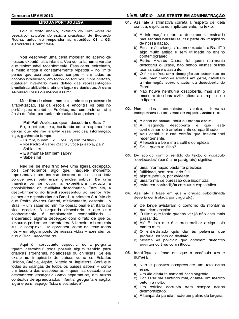 NVEL MDIO ASSISTENTE EM ADMINISTRAO 01. Assinale a afirmativa correta a respeito de ideia contida, explcita ou implicitamente, no texto: a) A informao sobre a descoberta, ensinada nas escolas brasileiras, faz parte do imaginrio de nossa nao. b) Ensinar s crianas quem descobriu o Brasil algo muito antigo e sem utilidade no ensino contemporneo. c) Pedro lvares Cabral foi quem realmente descobriu o Brasil, no sendo vlidas outras teorias sobre o assunto. d) O filho sofreu uma decepo ao saber que os pais, bem como os adultos em geral, detinham a informao sobre o autor da descoberta do Brasil. e) No houve nenhuma descoberta, mas sim o encontro de duas civilizaes: a europeia e a indgena. 02. Num dos enunciados abaixo, torna-se indispensvel a presena de vrgula. Assinale-o: a) A cena se passou mais ou menos assim. b) A segunda descoberta que este conhecimento amplamente compartilhado. c) Vou cont-la numa verso que testemunhei recentemente. d) A terceira bem mais sutil e complexa. e) Sei... quem foi filho? 03. De acordo com o sentido do texto, o vocbulo obviedades (penltimo pargrafo) significa: a) b) c) d) e) uma informao bastante preciosa. futilidade, sem resultado til. algo suprfluo, por evidente. uma forma de opresso que incomoda. estar em contradio com uma expectativa.