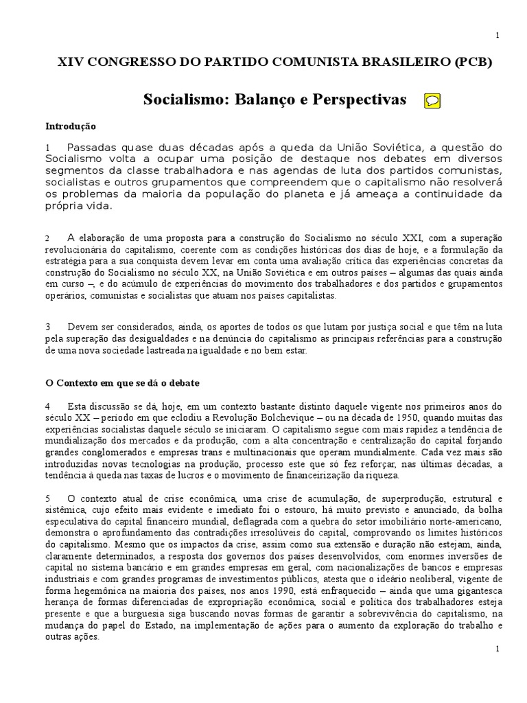 Introduo 1 Passadas quase duas dcadas aps a queda da Unio Sovitica, a questo do Socialismo volta a ocupar uma posio de destaque nos debates em diversos segmentos da classe trabalhadora e nas agendas de luta dos partidos comunistas, socialistas e outros grupamentos que compreendem que o capitalismo no resolver os problemas da maioria da populao do planeta e j ameaa a continuidade da prpria vida. A elaborao de uma proposta para a construo do Socialismo no sculo XXI, com a superao revolucionria do capitalismo, coerente com as condies histricas dos dias de hoje, e a formulao da estratgia para a sua conquista devem levar em conta uma avaliao crtica das experincias concretas da construo do Socialismo no sculo XX, na Unio Sovitica e em outros pases algumas das quais ainda em curso , e do acmulo de experincias do movimento dos trabalhadores e dos partidos e grupamentos operrios, comunistas e socialistas que atuam nos pases capitalistas.
