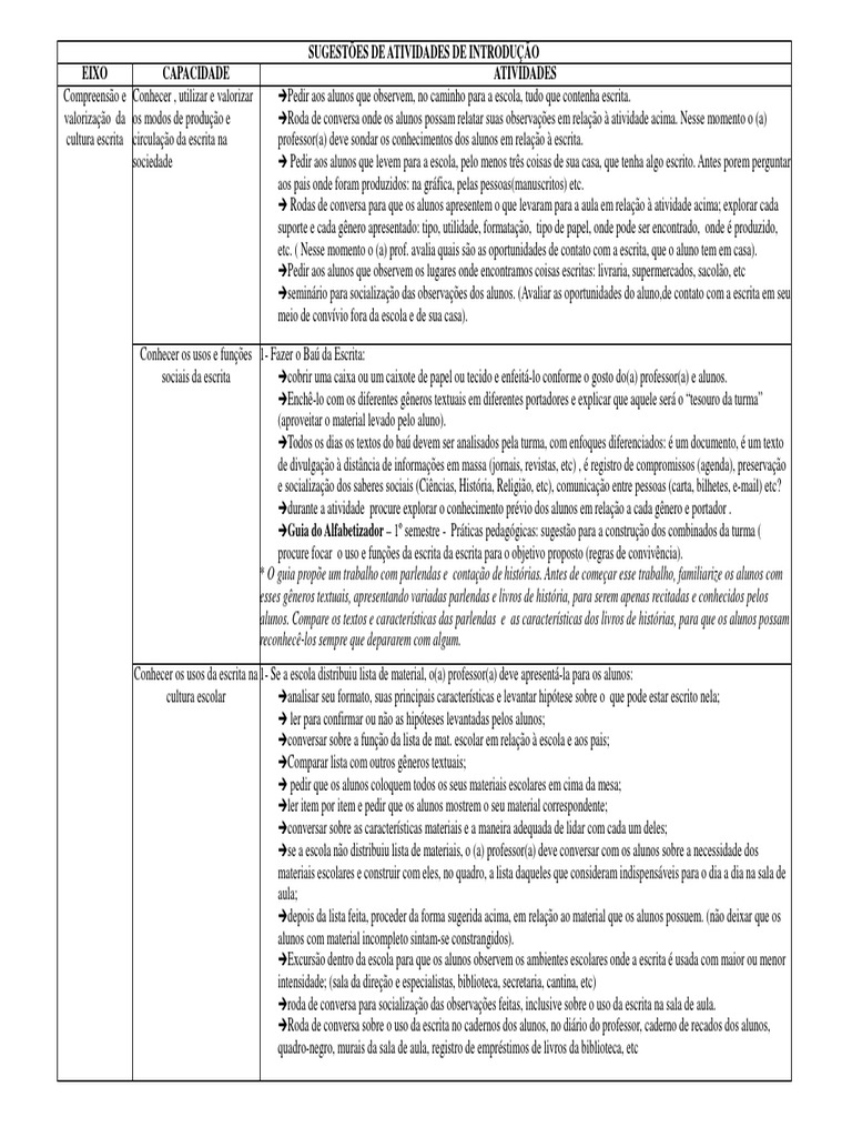 Conhecer os usos e funes 1- Fazer o Ba da Escrita: sociais da escrita cobrir uma caixa ou um caixote de papel ou tecido e enfeit-lo conforme o gosto do(a) professor(a) e alunos. Ench-lo com os diferentes gneros textuais em diferentes portadores e explicar que aquele ser o tesouro da turma (aproveitar o material levado pelo aluno). Todos os dias os textos do ba devem ser analisados pela turma, com enfoques diferenciados: um documento, um texto de divulgao distncia de informaes em massa (jornais, revistas, etc) , registro de compromissos (agenda), preservao e socializao dos saberes sociais (Cincias, Histria, Religio, etc), comunicao entre pessoas (carta, bilhetes, e-mail) etc? durante a atividade procure explorar o conhecimento prvio dos alunos em relao a cada gnero e portador . Guia do Alfabetizador 1 semestre - Prticas pedaggicas: sugesto para a construo dos combinados da turma ( procure focar o uso e funes da escrita da escrita para o objetivo proposto (regras de convivncia). * O guia prope um trabalho com parlendas e contao de histrias. Antes de comear esse trabalho, familiarize os alunos com esses gneros textuais, apresentando variadas parlendas e livros de histria, para serem apenas recitadas e conhecidos pelos alunos. Compare os textos e caractersticas das parlendas e as caractersticas dos livros de histrias, para que os alunos possam reconhec-los sempre que depararem com algum. Conhecer os usos da escrita na 1- Se a escola distribuiu lista de material, o(a) professor(a) deve apresent-la para os alunos: cultura escolar analisar seu formato, suas principais caractersticas e levantar hiptese sobre o que pode estar escrito nela; ler para confirmar ou no as hipteses levantadas pelos alunos; conversar sobre a funo da lista de mat. escolar em relao escola e aos pais; Comparar lista com outros gneros textuais; pedir que os alunos coloquem todos os seus materiais escolares em cima da mesa; ler item por item e pedir que os alunos mostrem o seu material correspondente; conversar sobre as caractersticas materiais e a maneira adequada de lidar com cada um deles; se a escola no distribuiu lista de materiais, o (a) professor(a) deve conversar com os alunos sobre a necessidade dos materiais escolares e construir com eles, no quadro, a lista daqueles que consideram indispensveis para o dia a dia na sala de aula; depois da lista feita, proceder da forma sugerida acima, em relao ao material que os alunos possuem. (no deixar que os alunos com material incompleto sintam-se constrangidos). Excurso dentro da escola para que os alunos observem os ambientes escolares onde a escrita usada com maior ou menor intensidade; (sala da direo e especialistas, biblioteca, secretaria, cantina, etc) roda de conversa para socializao das observaes feitas, inclusive sobre o uso da escrita na sala de aula. Roda de conversa sobre o uso da escrita no cadernos dos alunos, no dirio do professor, caderno de recados dos alunos, quadro-negro, murais da sala de aula, registro de emprstimos de livros da biblioteca, etc