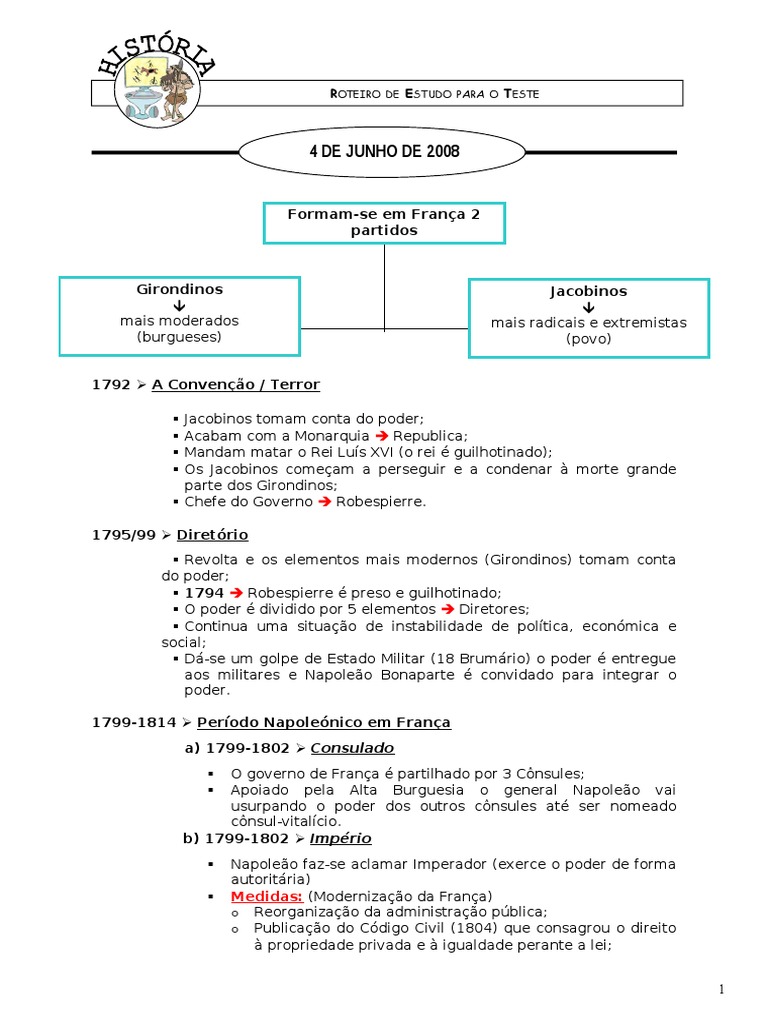 Jacobinos tomam conta do poder; Acabam com a Monarquia Republica; Mandam matar o Rei Lus XVI (o rei guilhotinado); Os Jacobinos comeam a perseguir e a condenar morte grande parte dos Girondinos; Chefe do Governo Robespierre. 1795/99 Diretrio Revolta e os elementos mais modernos (Girondinos) tomam conta do poder; 1794 Robespierre preso e guilhotinado; O poder dividido por 5 elementos Diretores; Continua uma situao de instabilidade de poltica, econmica e social; D-se um golpe de Estado Militar (18 Brumrio) o poder entregue aos militares e Napoleo Bonaparte convidado para integrar o poder. 1799-1814 Perodo Napolenico em Frana a) 1799-1802 Consulado O governo de Frana partilhado por 3 Cnsules; Apoiado pela Alta Burguesia o general Napoleo vai usurpando o poder dos outros cnsules at ser nomeado cnsul-vitalcio. b) 1799-1802 Imprio Napoleo faz-se aclamar Imperador (exerce o poder de forma autoritria) Medidas: (Modernizao da Frana) o Reorganizao da administrao pblica; o Publicao do Cdigo Civil (1804) que consagrou o direito propriedade privada e igualdade perante a lei;
