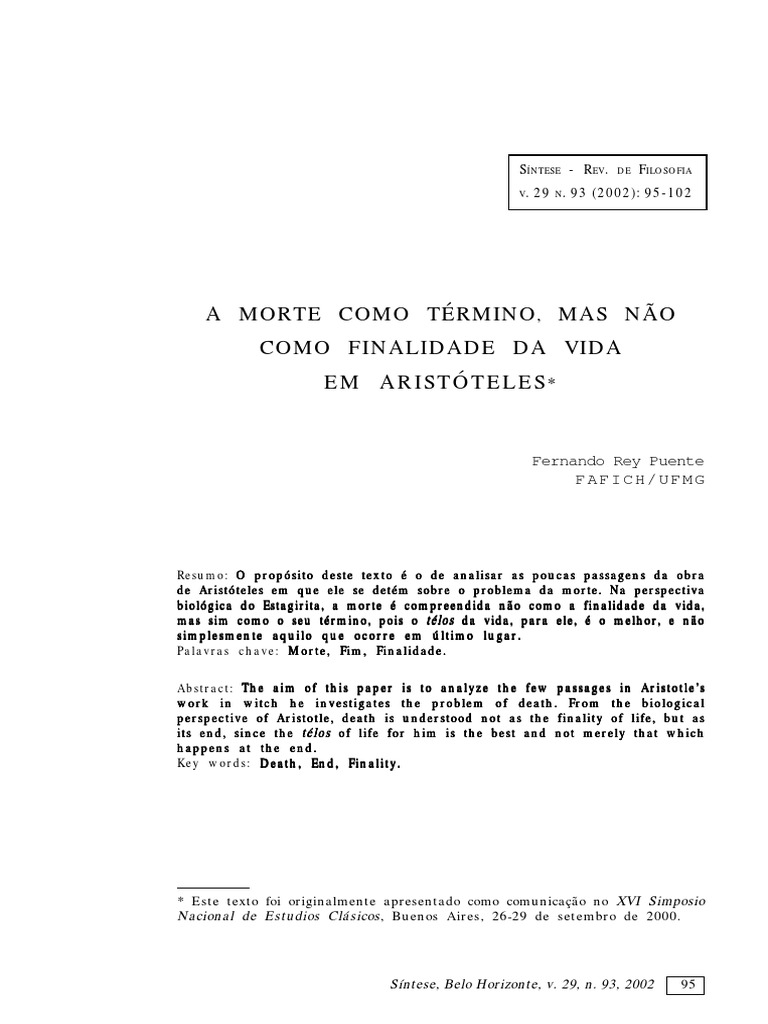 Resumo: O propsito deste texto o de analisar as poucas passagens da obra de Aristteles em que ele se detm sobre o problema da morte. Na perspectiva biolgica do Estagirita, a morte compreendida no como a finalidade da vida, mas sim como o seu trmino, pois o tlos da vida, para ele, o melhor, e no simplesmente aquilo que ocorre em ltimo lugar. Palavras chave: Morte, Fim, Finalidade. Abstract: The aim of this paper is to analyze the few passages in Aristotles work in witch he investigates the problem of death. From the biological perspective of Aristotle, death is understood not as the finality of life, but as its end, since the tlos of life for him is the best and not merely that which happens at the end. Key words: Death, End, Finality.