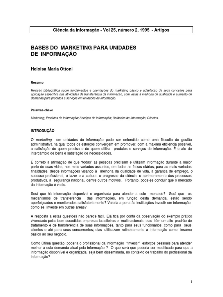 , BLOOM P. N. Marketing para servios profissionais. So Paulo : Atlas, 1983. LIMA, R. C. M. Sistemas de informao e Marketing. Trabalho apresentado no Encontro Nacional de Biblioteconomia e Informtica, 2. Braslia, 1986. In: SILVEIRA, A. AMARAL, S. A., comp. Marketing em Unidades de Informao: estudos brasileiros. Braslia : IBICT/SENAI, 1993. 365P. P.307-314. MANZO, J. M. Fundamentos de Marketing. 4.ed. Rio de Janeiro : Zahar, 1982. lv. MATTHEWS, A. Segmentao do mercado de Bibliotecas: uma abordagem para atender s necessidades dos clientes; Librarianship Marketing segmentation: an approach for meeting clients needs. J. of Library Administration, v.4, n.4, p.19-31, 1983. In: SILVEIRA, A., org. Marketing em bibliotecas e servios de informao; textos selecionados . Braslia : IBICT, 1987. 185p. p.83-103. McKAY, E. The marketing mystique. New York : American Management Association, 1972. lv. McKENNA, R. Estratgias de Marketing em tempos de crise. Trad. por Elisabeth M. de P. Braga. Rio de Janeiro : Campus, 1989. 179p. OLIVEIRA, S. M. de. Marketing e sua aplicao em Bibliotecas: uma abordagem preliminar. Cincia da Informao, v.14, n.2, p.137-147, 1985. In: SILVEIRA, A. AMARAL, S. A. comp. Marketing em Unidades de Informao: estudos brasileiros. Braslia: IBICT/SENAI, 1993. 365p. p.207-227. SAPIRO, A. Inteligncia empresarial: a revoluo em Marketing informacional de ao competitiva. R.A.E., v.33, n.3, p.106-124, maio/jun. 1993. SILVEIRA, A. A literatura brasileira de Marketing em Bibliotecas e servios de informao: de informao: de julho de 1977 a julho de 1992. In: , AMARAL, S. A., comp. Marketing em Unidades de Informao: estudos brasileiros . Braslia : IBICT/SENAI, 1993. . Marketing em sistemas de informao; uma viso geral. Cincia da informao, v.15, n.1, p.45-52, 1986. , org. Marketing em Bibliotecas e servios de informao; textos selecionados . Braslia : IBICT, 1987. 186p. , AMARAL, S. A., comp. Marketing em Unidades de Informao: estudos brasileiros. Braslia : IBICT/SENAI, 1993. 365p. WEINGAND, D. E. Distribuio do produto da Biblioteca; a necessidade de inovao; distribution of the librarys products; the need od innovation. J. of Library Administration, v.4, n.4, p.4957, 1983. In: SILVEIRA, A., org. Marketing em Bibliotecas e servios de informao; textos selecionados. Braslia : IBICT, 1987. 185p. p.155-169. WOOD, E. Planejamento estratgico e processo de Marketing: aplicao em Bibliotecas e servios de informao; strategic planning and the Marketing processo: library applications. J. of Academic Librarianship, v.9, n.1, p.15-20, 1983. In: SILVEIRA, A., org. Marketing em Bibliotecas e servios de informao; textos selecionados. Braslia : IBICT, 1987. 185p. p.67-81.