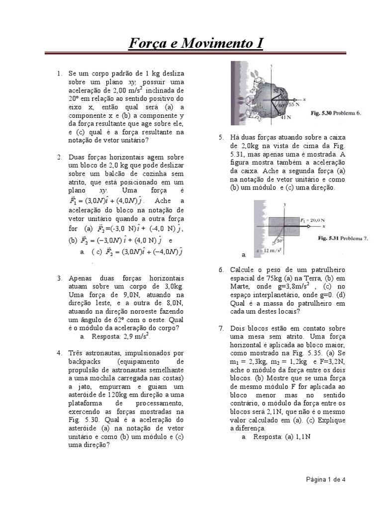 1. Se um corpo padro de 1 kg desliza sobre um plano xy, possuir uma acelerao de 2,00 m/s2 inclinada de 20 em relao ao sentido positivo do eixo x, ento qual ser (a) a componente x e (b) a componente y da fora resultante que age sobre ele, e (c) qual a fora resultante na notao de vetor unitrio? 2. Duas foras horizontais agem sobre um bloco de 2,0 kg que pode deslizar sobre um balco de cozinha sem atrito, que est posicionado em um plano xy. Uma fora (4,0 N ) F1 (3,0 N )i j . Ache a acelerao do bloco na notao de vetor unitrio quando a outra fora for (a) F2 =(-3,0 N) i + (-4,0 N) j, (b) F2 (3,0 N ) i + (4,0 N) j e (4,0 N ) a. ( c) F2 (3,0 N )i j . 3. Apenas duas foras horizontais atuam sobre um corpo de 3,0kg. Uma fora de 9,0N, atuando na direo leste, e a outra de 8,0N, atuando na direo noroeste fazendo um ngulo de 62 com o oeste. Qual o mdulo da acelerao do corpo? a. Resposta: 2,9 m/s2. 4. Trs astronautas, impulsionados por backpacks (equipamento de propulso de astronautas semelhante a uma mochila carregada nas costas) a jato, empurram e guiam um asteride de 120kg em direo a uma plataforma de processamento, exercendo as foras mostradas na Fig. 5.30. Qual a acelerao do asteride (a) na notao de vetor unitrio e como (b) um mdulo e (c) uma direo?