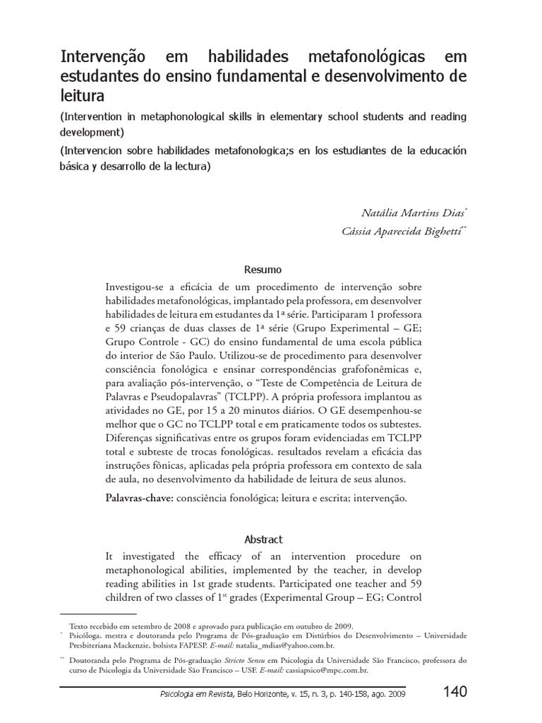 GC, assim como o padro de desempenho dos grupos e suas relativas diculdades, permite concluir que a interveno promovida pela professora participante sob a orientao da primeira autora deste artigo foi ecaz em promover ganhos na habilidade de leitura, sobretudo via rota fonolgica, e pode, portanto, ser considerada profcua facilitao da aquisio da linguagem escrita na alfabetizao. De fato, o grupo submetido interveno apresentou leitura fonolgica (ou estratgia alfabtica) relativamente melhor desenvolvida que o grupo controle, o qual apresenta um padro mais consistente com uma leitura mais pautada na similaridade visual do item escrito. No entanto, com relao ao GE, destaca-se que as habilidades de leitura encontram-se ainda em desenvolvimento e, portanto, a continuidade na administrao do procedimento seria bastante apropriada. Cabe relevar que o estudo contou com algumas limitaes metodolgicas, como a no realizao de uma avaliao pr-interveno e nmero amostral limitado, o que pode ter diminudo a extenso da signicncia estatstica dos resultados aqui apresentados. Ainda, faz-se importante destacar que eventos diversos ocorridos no ms de outubro (Semana da Criana, Olimpadas Estudantis e afastamento da professora pelo perodo de uma semana) interromperam o andamento da interveno em diversos momentos, o que pode ter comprometido os resultados. Pesquisas futuras, mais controladas, fazem-se pertinentes, tomando amostras maiores e outros nveis de escolaridade, de modo a ampliar tais achados. De uma forma geral, o estudo rearma a eccia das intervenes pautadas no mtodo fnico no desenvolvimento da habilidade de leitura e a possibilidade de conduo de tais atividades pela prpria professora, com frequncia, porm por perodos curtos e sem prejuzo do contedo formal ministrado em sala de aula. Assim, lana contribuies profcuas da Psicologia Educao.