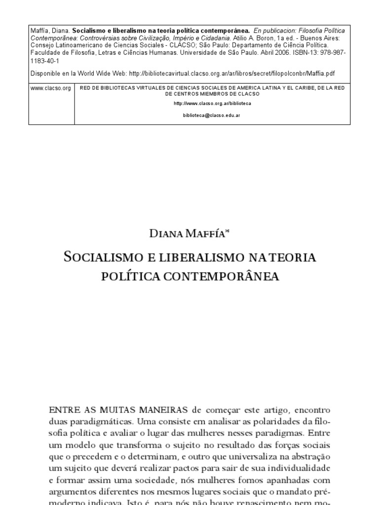 Maffía, Diana. Socialismo e liberalismo na teoria política contemporânea. En publicacion: Filosofia Política Contemporãnea: Controvérsias sobre Civilização, Império e Cidadania. Atilio A. Boron, 1a ed. - Buenos Aires: