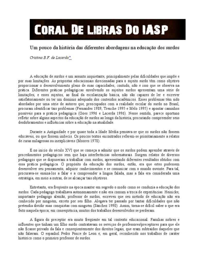 A short historR of different approaches to the education of the deaf ABSTRACT: T e education of t e deaf is a comple! pro"lem c aracterised "# difficulties and limitations. T roug out istor#$ t is su"%ect as "een polemic "ringing different conse&uences to t at education. T is article aims at presenting t e istor# of t e education of t e deaf focusing on oralism$ total communication$ "ilinguism and its conse&uences.