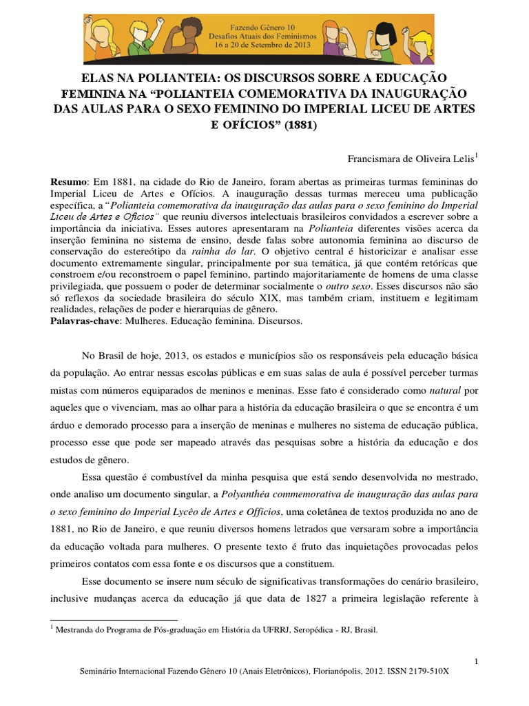 Resumo: Em 1881, na cidade do Rio de Janeiro, foram abertas as primeiras turmas femininas do Imperial Liceu de Artes e Ofícios. A inauguração dessas turmas mereceu uma publicação específica, a “Polianteia comemorativa da inauguração das aulas para o sexo feminino do Imperial Liceu de Artes e Ofícios” que reuniu diversos intelectuais brasileiros convidados a escrever sobre a importância da iniciativa. Esses autores apresentaram na Polianteia diferentes visões acerca da inserção feminina no sistema de ensino, desde falas sobre autonomia feminina ao discurso de conservação do estereótipo da rainha do lar. O objetivo central é historicizar e analisar esse documento extremamente singular, principalmente por sua temática, já que contém retóricas que constroem e/ou reconstroem o papel feminino, partindo majoritariamente de homens de uma classe privilegiada, que possuem o poder de determinar socialmente o outro sexo. Esses discursos não são só reflexos da sociedade brasileira do século XIX, mas também criam, instituem e legitimam realidades, relações de poder e hierarquias de gênero. Palavras-chave: Mulheres. Educação feminina. Discursos.