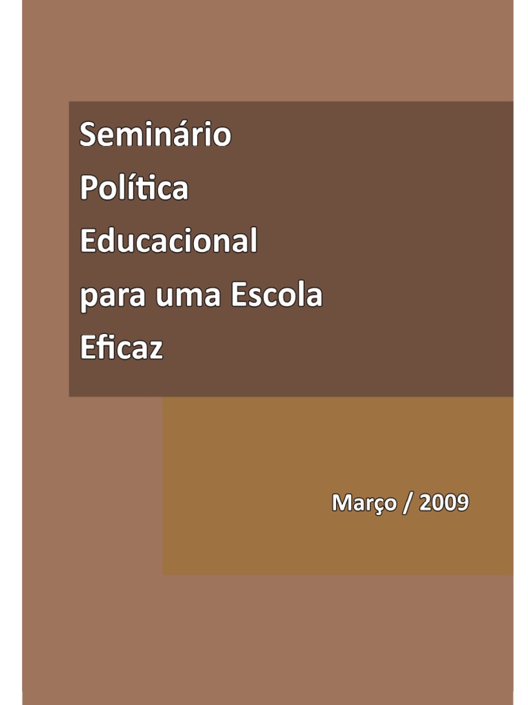 Precisamos contribuir para criar a escola que aventura, que marcha, que no tem medo do risco, por isso que recusa o imobilismo. A escola em que se pensa, em que se atua, em que se cria, em que se fala, em que se ama, se adivinha, a escola que apaixonadamente diz sim a vida... Paulo Freire Dados tcnicos Seminrio Poltica Educacional para uma Escola Eficaz Realizado nos dias 23 e 24 de maro de 2009, no auditrio da Fundao Escola de Servio Pblico do Governo do Estado do Rio de Janeiro Palestrantes: Ana Canen - PhD em Educao pela Universidade de Glasgow e mestre em Educao pela PUC-Rio; Ana Gabriela Pessoa - bacharel em Poltica, Filosofia e Economia e mestre em Educao; Claudio Mendona presidente da Fundao Escola de Servio Pblico do Estado do Rio de Janeiro - foi Secretrio de Estado e Presidente do Conselho Estadual de Educao (1994) e Secretrio de Estado de Educao (2004-2006); Guiomar Namo de Mello - Diretora da EBRAPA (Escola Brasileira de Professores) Doutora em Educao pela PUC/SP, com Ps Doutorado em Educao Comparada pelo Instituto de Educao da Universidade de Londres, Inglaterra; Lina Ktia - especializada em Educao para a Matemtica e mestre em Educao pela Universidade Federal de Juiz de Fora. Atualmente Coordenadora da Unidade de Avaliao da Fundao de Apoio e Desenvolvimento ao Ensino e Extenso; Lucindo Ferreira da Silva Filho pedagogo, especialista em gesto escolar, especialista em educao especial e Mestre em Educao (UNESA); foi Diretor Tcnico do Instituto Benjamin Constant. Atualmente Diretor do Instituto Superior de Administrao Pblica da FESP Nigel Brooke - professor convidado da Universidade Federal de Minas Gerais e consultor do Grupo de Avaliao e Medidas Educacionais da Faculdade de Educao. PhD em Estudos de Desenvolvimento da Universidade de Sussex, Inglaterra.