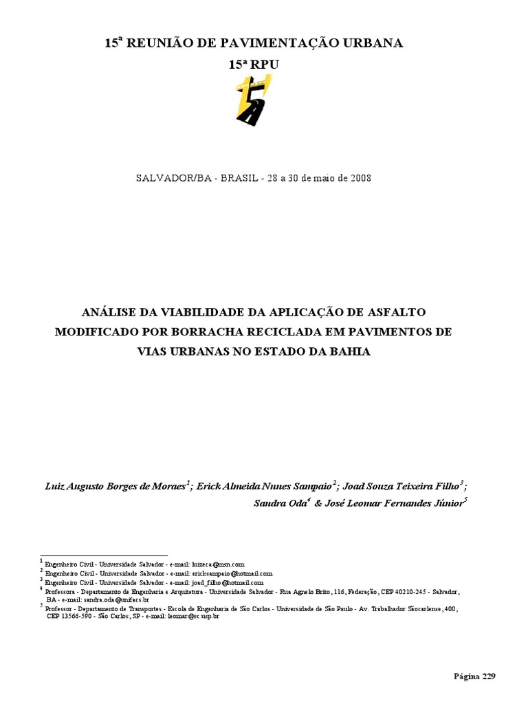 Universidad de Costa Rica, 2005. ODA, S.; EDEL, G. Aplicação de asfalto-borracha em trechos experimentais no município de Salvador, BA. Relatório Técnico. Projeto de Apoio Regular. Salvador, BA: Fundação de Amparo a Pesquisa do Estado da Bahia – FAPESB,