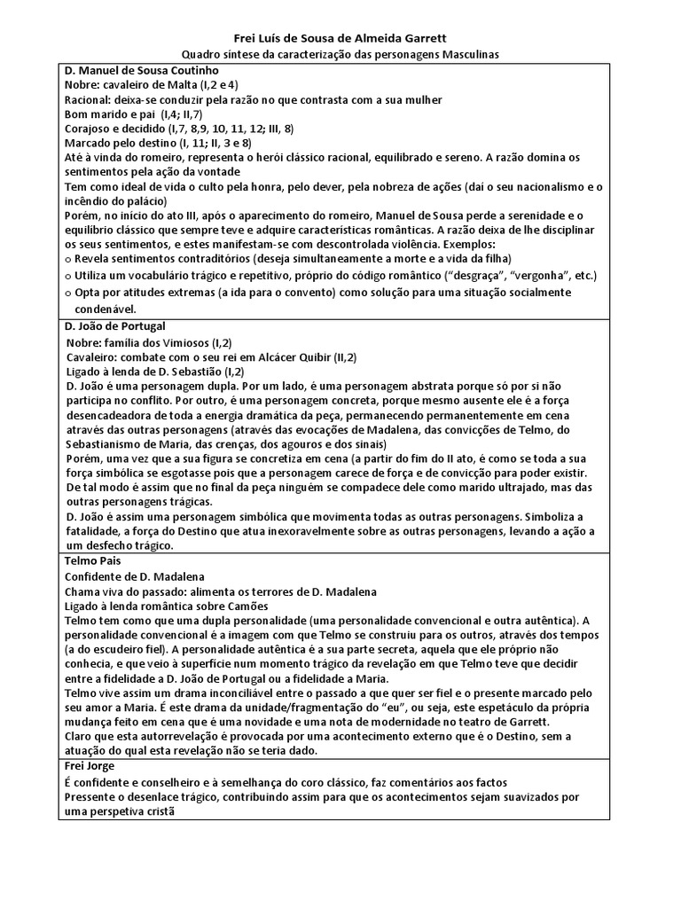 Quadro sntese da caracterizao das personagens Masculinas D. Manuel de Sousa Coutinho Nobre: cavaleiro de Malta (I,2 e 4) Racional: deixa-se conduzir pela razo no que contrasta com a sua mulher Bom marido e pai (I,4; II,7) Corajoso e decidido (I,7, 8,9, 10, 11, 12; III, 8) Marcado pelo destino (I, 11; II, 3 e 8) At vinda do romeiro, representa o heri clssico racional, equilibrado e sereno. A razo domina os sentimentos pela ao da vontade Tem como ideal de vida o culto pela honra, pelo dever, pela nobreza de aes (da o seu nacionalismo e o incndio do palcio) Porm, no incio do ato III, aps o aparecimento do romeiro, Manuel de Sousa perde a serenidade e o equilbrio clssico que sempre teve e adquire caractersticas romnticas. A razo deixa de lhe disciplinar os seus sentimentos, e estes manifestam-se com descontrolada violncia. Exemplos: o Revela sentimentos contraditrios (deseja simultaneamente a morte e a vida da filha) o Utiliza um vocabulrio trgico e repetitivo, prprio do cdigo romntico (desgraa, vergonha, etc.) o Opta por atitudes extremas (a ida para o convento) como soluo para uma situao socialmente condenvel. D. Joo de Portugal Nobre: famlia dos Vimiosos (I,2) Cavaleiro: combate com o seu rei em Alccer Quibir (II,2) Ligado lenda de D. Sebastio (I,2) D. Joo uma personagem dupla. Por um lado, uma personagem abstrata porque s por si no participa no conflito. Por outro, uma personagem concreta, porque mesmo ausente ele a fora desencadeadora de toda a energia dramtica da pea, permanecendo permanentemente em cena atravs das outras personagens (atravs das evocaes de Madalena, das convices de Telmo, do Sebastianismo de Maria, das crenas, dos agouros e dos sinais) Porm, uma vez que a sua figura se concretiza em cena (a partir do fim do II ato, como se toda a sua fora simblica se esgotasse pois que a personagem carece de fora e de convico para poder existir. De tal modo assim que no final da pea ningum se compadece dele como marido ultrajado, mas das outras personagens trgicas. D. Joo assim uma personagem simblica que movimenta todas as outras personagens. Simboliza a fatalidade, a fora do Destino que atua inexoravelmente sobre as outras personagens, levando a ao a um desfecho trgico. Telmo Pais Confidente de D. Madalena Chama viva do passado: alimenta os terrores de D. Madalena Ligado lenda romntica sobre Cames Telmo tem como que uma dupla personalidade (uma personalidade convencional e outra autntica). A personalidade convencional a imagem com que Telmo se construiu para os outros, atravs dos tempos (a do escudeiro fiel). A personalidade autntica a sua parte secreta, aquela que ele prprio no conhecia, e que veio superfcie num momento trgico da revelao em que Telmo teve que decidir entre a fidelidade a D. Joo de Portugal ou a fidelidade a Maria. Telmo vive assim um drama inconcilivel entre o passado a que quer ser fiel e o presente marcado pelo seu amor a Maria. este drama da unidade/fragmentao do eu, ou seja, este espetculo da prpria mudana feito em cena que uma novidade e uma nota de modernidade no teatro de Garrett. Claro que esta autorrevelao provocada por uma acontecimento externo que o Destino, sem a atuao do qual esta revelao no se teria dado. Frei Jorge confidente e conselheiro e semelhana do coro clssico, faz comentrios aos factos Pressente o desenlace trgico, contribuindo assim para que os acontecimentos sejam suavizados por uma perspetiva crist
