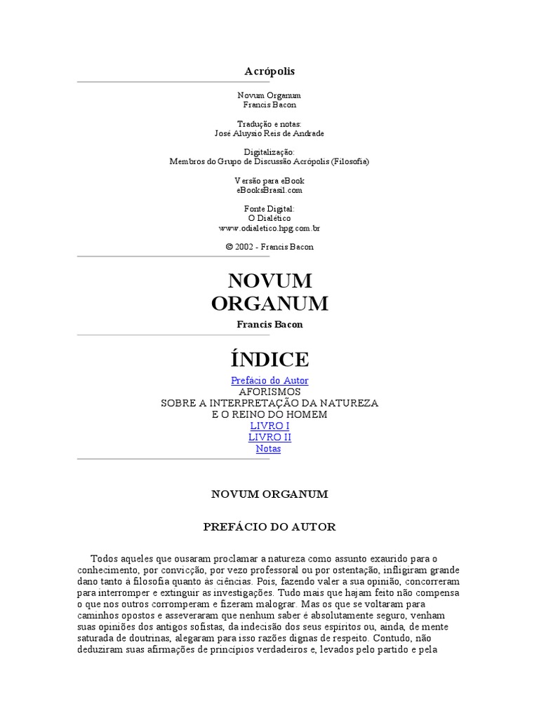 (erso eletrMnica do livro XNovum Organum ou (erdadeiras 3ndicaAes Acerca da 3nter#retao da NaturezaY Autor: Francis Bacon Traduo e notas: Jos Aluysio Reis de Andrade Drditos da digitalizao: em!ros do gru#o de discusso Acr$#olis %Filoso&ia' :ome#age do gru#o: ,tt#:ee!r*egrou#s*comegrou#eacro#olise A distri!uio desse ar<uivo %e de outros !aseados nele' livre> desde <ue se d@ os crditos da digitalizao aos mem!ros do gru#o Acr$#olis e se cite o endereo da ,ome#age do gru#o no cor#o do te=to do ar<uivo em <uesto> tal como est2 acima*