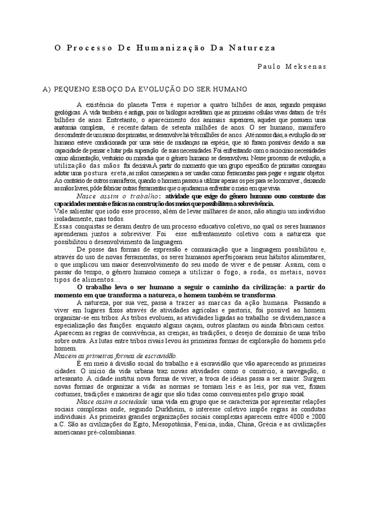 A) PEQUENO ESBOO DA E O!U"O DO SE# HUMANO A e$ist%ncia &o 'laneta (erra ) su'erior a *uatro +il,-es &e anos. se/un&o 'es*uisas /eol0/icas1 A 2i&a tam+)m ) anti/a. 'ois os +i0lo/os acre&itam *ue as 'rimeiras c)lulas 2i2as &atam &e tr%s +il,-es &e anos1 Entretanto. o a'arecimento &os animais su'eriores. a*ueles *ue 'ossuem uma anatomia com'le$a. ) recente3&atam &e setenta mil,-es &e anos1 O ser ,umano. mam45ero &escen&ente &e um ramo &os 'rimatas. se &esen2ol2e ,6 tr%s mil,-es &e anos1 At) nossos &ias. a e2oluo &o ser ,umano este2e con&iciona&a 'or uma s)rie &e mu&anas na es')cie. *ue s0 5oram 'oss42eis &e2i&o a sua ca'aci&a&e &e 'ensar e lutar 'ela su'erao &e suas necessi&a&es1 7oi en5rentan&o com o racioc4nio necessi&a&es como alimentao. 2estu6rio ou mora&ia *ue o /%nero ,umano se &esen2ol2eu1 Nesse 'rocesso &e e2oluo. a utilizao &as mos 5oi &ecisi2a1A 'artir &o momento *ue um /ru'o es'ec45ico &e 'rimatas conse/uiu a&otar uma 'ostura ereta.as mos comearam a ser usa&as como 5erramentas 'ara 'e/ar e se/urar o+8etos1 Ao contr6rio &e outros mam45eros. *uan&o o ,omem 'assou a utilizar a'enas os ')s 'ara se locomo2er1. &ei$an&o as mos li2res. '9&e 5a+ricar outras 5erramentas *ue o a8u&aram a en5rentar o meio em *ue 2i2ia1 Nasce assim o trabalho : atividade que exige do gnero humano ouso constante das capacidades mentais e fsicas na construo dos meios que possibilitem a sobrevivncia. ale salientar *ue io&o esse 'rocesso. al)m &e le2ar mil,ares &e anos. no atin/iu um in&i24&uo isola&amente. mas to&os1 Essas con*uistas se &eram &entro &e um 'rocesso e&ucati2o coleti2o. no *ual os seres ,umanos a'ren&eram 8untos a so+re2i2er1 7oi esse en5rentamento coleti2o com a natureza *ue 'ossi+ilitou o &esen2ol2imento &a lin/ua/em1 De 'osse &as 5ormas &e e$'resso e comunicao *ue a lin/ua/em 'ossi+ilitou e. atra2)s &o uso &e no2as 5erramentas. os seres ,umanos a'er5eioaram seus ,6+itos alimentares. o *ue im'licou um maior &esen2ol2imento &o seu mo&o &e 2i2er e &e 'ensar1 Assim. com o 'assar &o tem'o. o /%nero ,umano comea a utilizar o 5o/o. a ro&a. os metais. no2os ti'os &e alimentos111 O trabalho leva o ser humano a seguir o caminho da civilizao: a partir do momento em que transforma a natureza, o homem tamb m se transforma 1 A natureza. 'or sua 2ez. 'assa a trazer as marcas &a ao ,umana1 Passan&o a 2i2er em lu/ares 5i$os atra2)s &e ati2i&a&es a/r4colas e 'astoris. 5oi 'oss42el ao ,omem or/anizar:se em tri+os1 As tri+os e2oluem. as ati2i&a&es li/a&as ao tra+al,o 1se &i2i&em.nasce a es'ecializao &as 5un-es3 en*uanto al/uns caam. outros 'lantam ou ain&a 5a+ricam cestos1 A'arecem as re/ras &e con2i2%ncia. as crenas. as tra&i-es. o &ese8o &e &om4nio &e uma tri+o so+re outra1 As lutas entre tri+os ri2ais le2ou ;s 'rimeiras 5ormas &e e$'lorao &o ,omem 'elo ,omem1 Nascem as primeiras formas de escravido. < em meio ; &i2iso social &o tra+al,o e ; escra2i&o *ue 2o a'arecen&o as 'rimeiras ci&a&es1 O in4cio &a 2i&a ur+ana traz no2as ati2i&a&es como o com)rcio. a na2e/ao. o artesanato1 A ci&a&e institui no2a 5orma &e 2i2er= a troca &e i&)ias 'assa a ser maior1 Sur/em no2as 5ormas &e or/anizar a 2i&a3 as normas se tornam leis e as leis. 'or sua 2ez. 5i$am costumes. tra&i-es e maneiras &e a/ir *ue so ti&as como con2enientes 'elo /ru'o social1 Nasce assim a sociedade3 uma 2i&a em /ru'o *ue se caracteriza 'or a'resentar rela-es sociais com'le$as on&e. se/un&o Durk,eim. o interesse coleti2o im'-e re/ras ;s con&utas in&i2i&uais1 As 'rimeiras /ran&es or/aniza-es sociais com'le$as a'arecem entre >??? e @??? a1A1 So as ci2iliza-es &o E/ito. Meso'otBmia. 7en4cia. 4n&ia. A,ina. Cr)cia e as ci2iliza-es americanas 'r):colom+ianas1