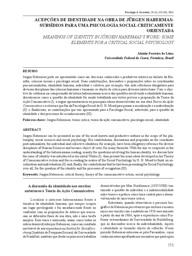 Palavras-chave: Jrgen Habermas; teoria critica; teoria da ao comunicativa; psicologia social; identidade.