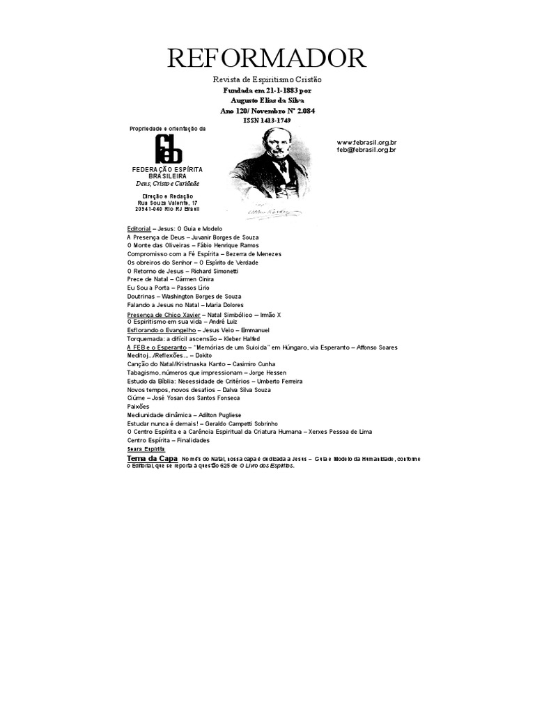 Editorial Jesus: O Guia e Modelo A Presena de Deus Juvanir Borges de Souza O Monte das Oliveiras Fbio Henrique Ramos Compromisso com a F Esprita Bezerra de Menezes Os obreiros do Senhor O Esprito de Verdade O Retorno de Jesus Richard Simonetti Prece de Natal Crmen Cinira Eu Sou a Porta Passos Lrio Doutrinas Washington Borges de Souza Falando a Jesus no Natal Maria Dolores Presena de Chico Xavier Natal Simblico Irmo X O Espiritismo em sua vida Andr Luiz Esflorando o Evangelho Jesus Veio Emmanuel Torquemada: a difcil ascenso Kleber Halfed A FEB e o Esperanto Memrias de um Suicida em Hngaro, via Esperanto Affonso Soares Meditoj.../Reflexes... Dokito Cano do Natal/Kristnaska Kanto Casimiro Cunha Tabagismo, nmeros que impressionam Jorge Hessen Estudo da Bblia: Necessidade de Critrios Umberto Ferreira Novos tempos, novos desafios Dalva Silva Souza Cime Jos Yosan dos Santos Fonseca Paixes Mediunidade dinmica Adilton Pugliese Estudar nunca demais! Geraldo Campetti Sobrinho O Centro Esprita e a Carncia Espiritual da Criatura Humana Xerxes Pessoa de Lima Centro Esprita Finalidades