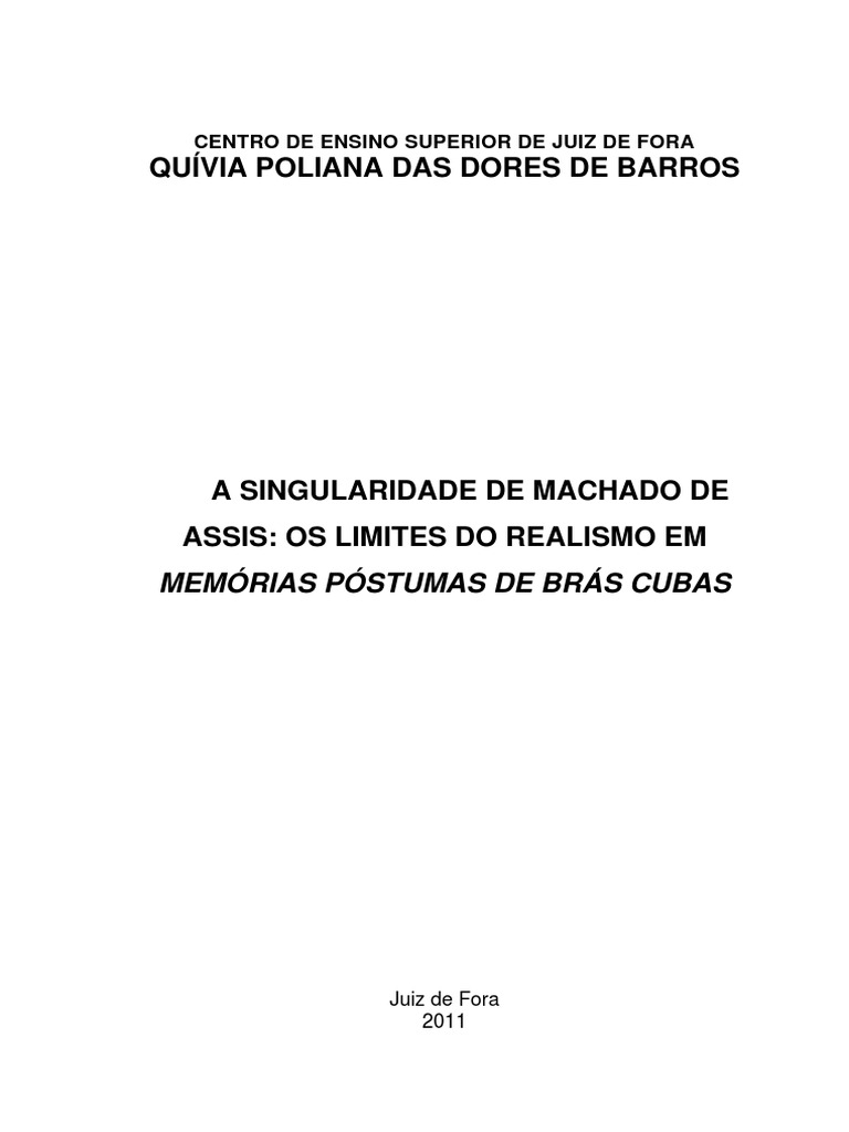BARROS, Quvia Poliana das Dores de. A singularidade de Machado de Assis: os limites do Realismo em Memrias pstumas de Brs Cubas. Dissertao apresentada ao Centro de Ensino Superior de Juiz de Fora, como requisito parcial para a obteno do ttulo de Mestre em Letras, realizada no segundo semestre de 2011.