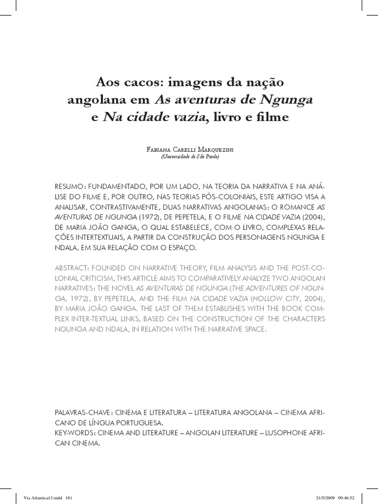 lonial cRiticism, this aRticle aims to compaRatively analyze two angolan naRRatives: the novel as aveNturas de NGuNGa (the adveNtures of NGuN- Ga, 1972), by pepetela, and the film Na cidade vazia (hollow city, 2004), by maRia joão ganga. the last of them establishes with the booK com- plex inteR-textual linKs, based on the constRuction of the chaRacteRs ngunga and ndala, in Relation with the naRRative space.