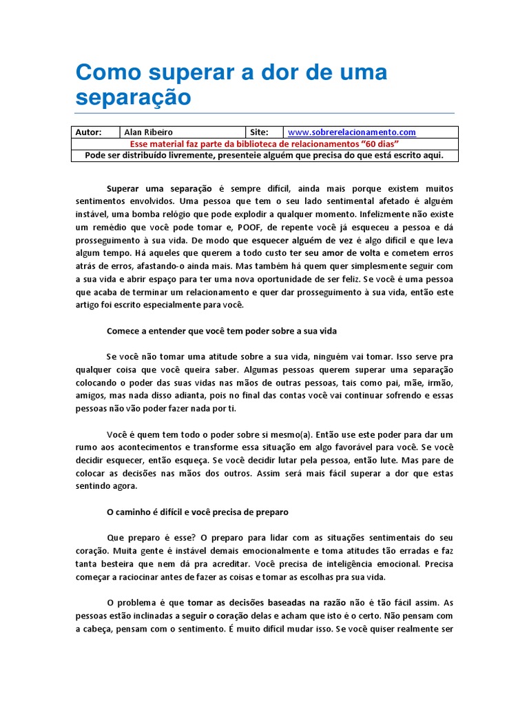 Superar uma separação é sempre difícil, ainda mais porque existem muitos sentimentos envolvidos. Uma pessoa que tem o seu lado sentimental afetado é alguém instável, uma bomba relógio que pode explodir a qualquer momento. Infelizmente não existe um remédio que você pode tomar e, POOF, de repente você já esqueceu a pessoa e dá prosseguimento à sua vida. De modo que esquecer alguém de vez é algo difícil e que leva algum tempo. Há aqueles que querem a todo custo ter seu amor de volta e cometem erros atrás de erros, afastando-o ainda mais. Mas também há quem quer simplesmente seguir com