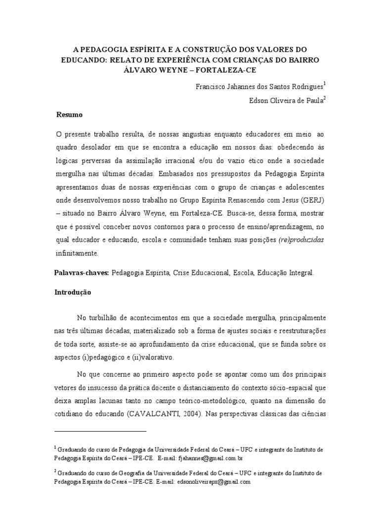 Pedagogia Espírita do Ceará – IPE-CE. E-mail: fjahannes@gmail.com.br