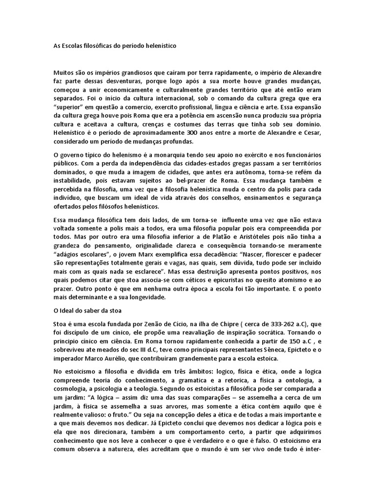 Esse texto nos mostra as diferentes filosofias no perodo helenstico, que foi responsvel por