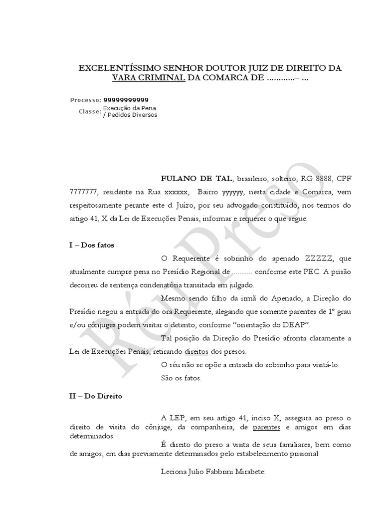 artigo 41, X da Lei de Execues Penais, informar e requerer o que segue: