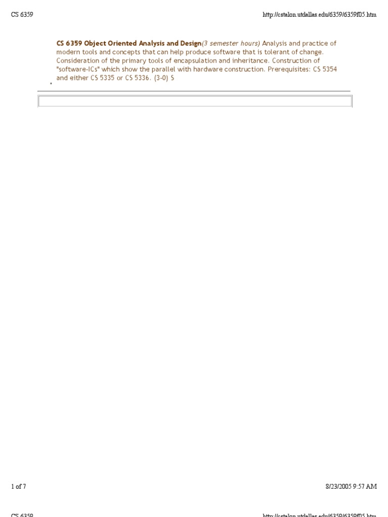 CS 6359 Object Oriented Analysis and Design(3 semester hours) Analysis and practice of modern tools and concepts that can help produce software that is tolerant of change. Consideration of the primary tools of encapsulation and inheritance. Construction of "software-ICs" which show the parallel with hardware construction. Prerequisites: CS 5354 and either CS 5335 or CS 5336. (3-0) S