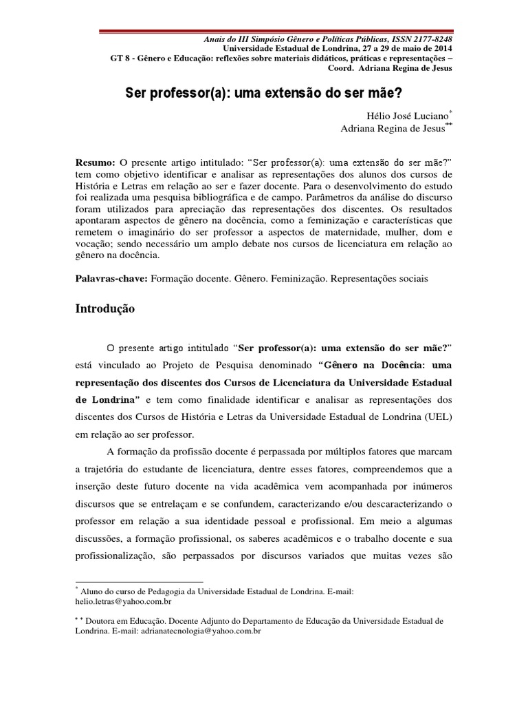 O presente artigo intitulado “Ser professor(a): uma extensão do ser mãe?”