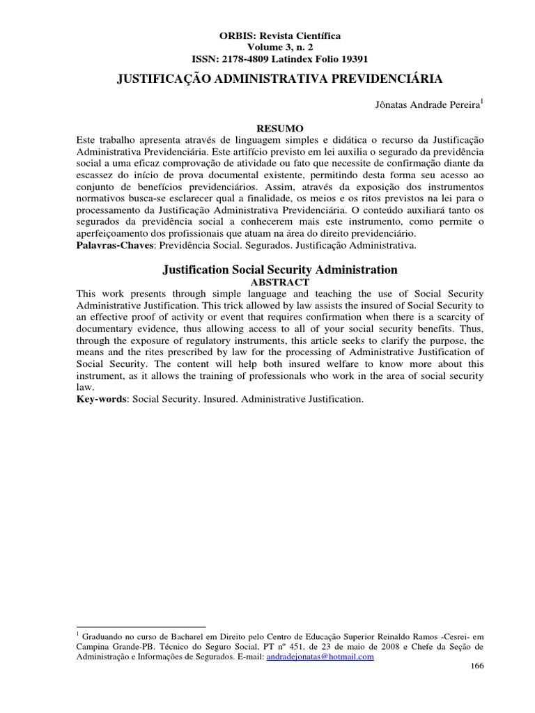 ABSTRACT This work presents through simple language and teaching the use of Social Security Administrative Justification. This trick allowed by law assists the insured of Social Security to an effective proof of activity or event that requires confirmation when there is a scarcity of documentary evidence, thus allowing access to all of your social security benefits. Thus, through the exposure of regulatory instruments, this article seeks to clarify the purpose, the means and the rites prescribed by law for the processing of Administrative Justification of Social Security. The content will help both insured welfare to know more about this instrument, as it allows the training of professionals who work in the area of social security law. Key-words: Social Security. Insured. Administrative Justification.