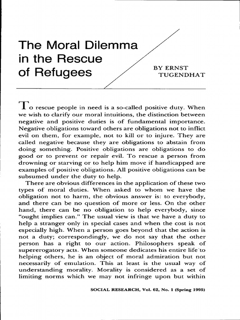 First, the main cause for the current increase in political refugees is a self-understanding of groups in particularistic terms which ultimately implies the denial of universal respect and of human rights altogether. Now this particularistic tide, found in the countries which produce refugees, is equally characteristic for large parts of the populations of the countries which could receive refugees. My second and third propositions point to the probable expectations even in the improbable case that ethnic thinking should be overcome. Thus, second, even if ethnic strife should recede, we must anticipate further wars and civil wars caused by the aggravation of economic and ecological conditions, that is to say, the amount of people which will be required to be rescued will in all probability increase even without ethnic strife and even if rescue be interpreted narrowly and restricted to refugees suffering from persecution. And, third, even supposing that the xenophobic tendencies in the better off countries that in principle could rescue refugees were overcome, that is to say, even supposing that we did understand ourselves morally, the rescue of aliens in great numbers in spite of economic problems which this creates presupposes a more than average humanitarian attitude, a self-understanding of the population which would not only be moral but would go beyond the confines of normal morality some way toward a supererogatory ideal. The outlook for a solution of the problem of refugees at