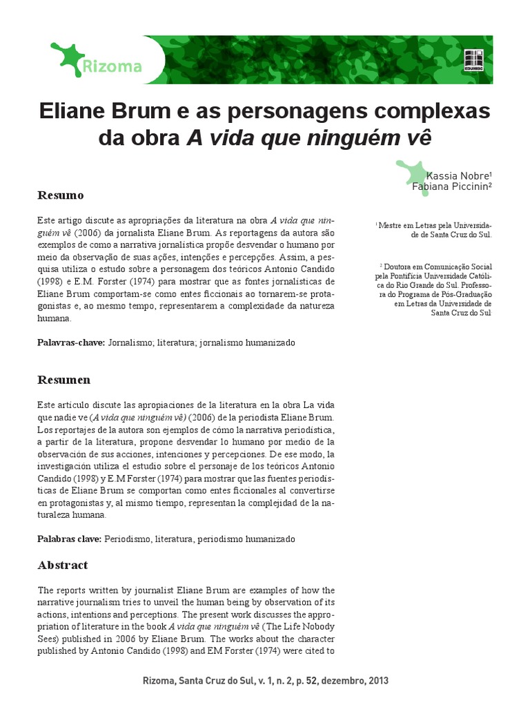 Candido (1998) y E.M Forster (1974) para mostrar que las fuentes periodsticas de Eliane Brum se comportan como entes ficcionales al convertirse