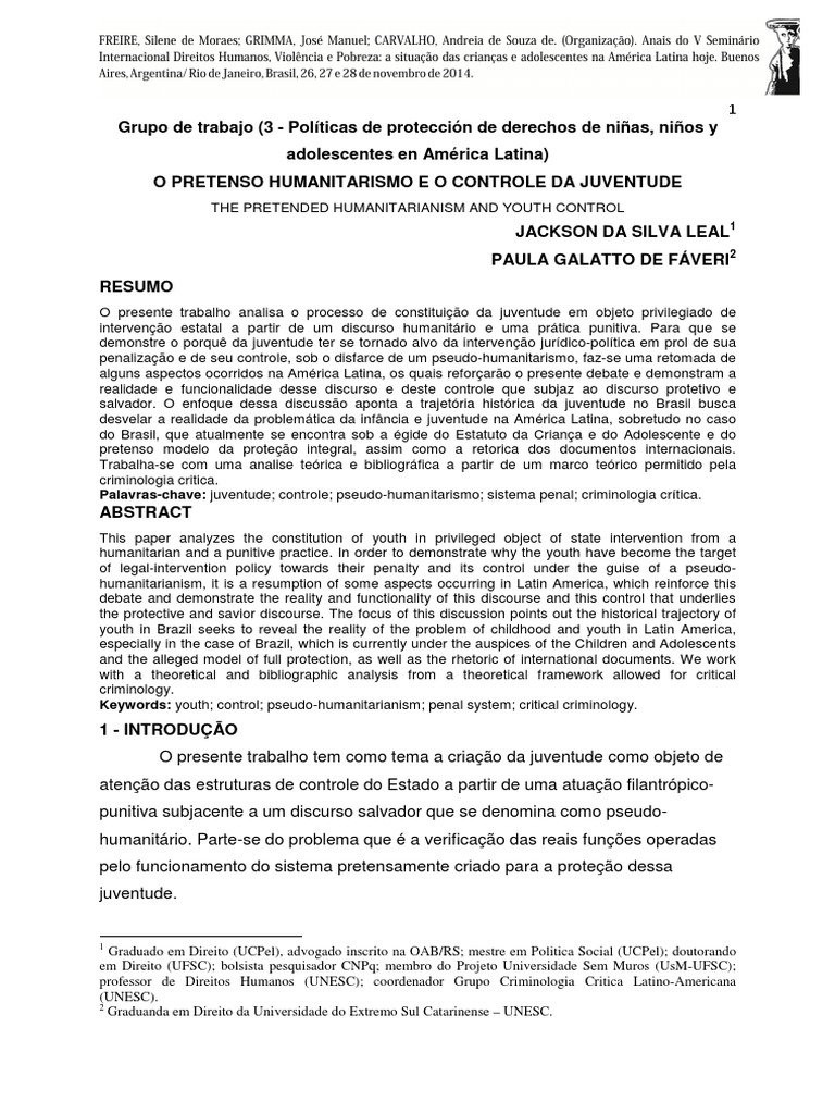 1 - INTRODUÇÃO O presente trabalho tem como tema a criação da juventude como objeto de atenção das estruturas de controle do Estado a partir de uma atuação filantrópico- punitiva subjacente a um discurso salvador que se denomina como pseudo- humanitário. Parte-se do problema que é a verificação das reais funções operadas pelo funcionamento do sistema pretensamente criado para a proteção dessa juventude.