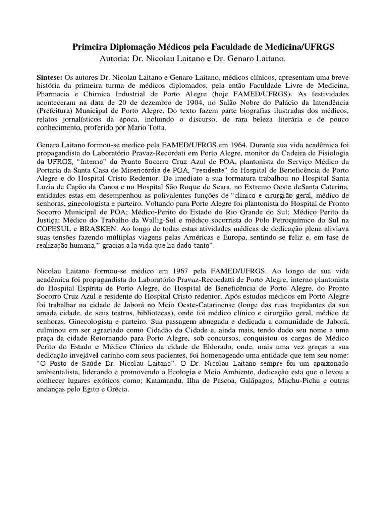 Sntese: Os autores Dr. Nicolau Laitano e Genaro Laitano, mdicos clnicos, apresentam uma breve