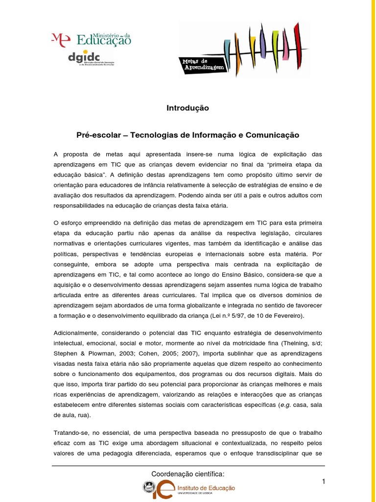 O esforço empreendido na definição das metas de aprendizagem em TIC para esta primeira etapa da educação partiu não apenas da análise da respectiva legislação, circulares normativas e orientações curriculares vigentes, mas também da identificação e análise das políticas, perspectivas e tendências europeias e internacionais sobre esta matéria. Por conseguinte, embora se adopte uma perspectiva mais centrada na explicitação de aprendizagens em TIC, e tal como acontece ao longo do Ensino Básico, considera-se que a aquisição e o desenvolvimento dessas aprendizagens sejam assentes numa lógica de trabalho articulada entre as diferentes áreas curriculares. Tal implica que os diversos domínios de aprendizagem sejam abordados de uma forma globalizante e integrada no sentido de favorecer a formação e o desenvolvimento equilibrado da criança (Lei n.º 5/97, de 10 de Fevereiro).