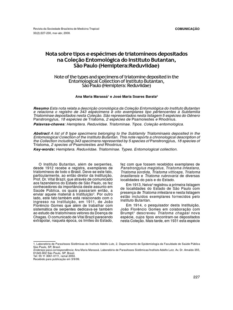 Key-words: Hemiptera. Reduviidae. Triatominae. Types. Entomological collection.