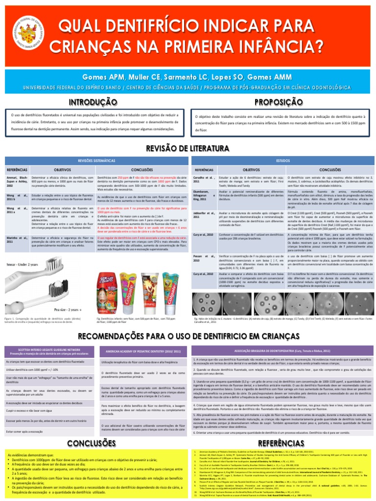 ingerida é segura em termos de fluorose dental, e o benefício anticárie mantido. O uso do dentifrício fluoretado deve ser recomendado como um procedimento preventivo básico. Como a ingestão de dentifrício com flúor carrega um risco aumentado de fluorose, este risco deve ser pesado em relação ao benefício na prevenção da cárie. Os pais/responsáveis devem ser instruídos pelo dentista quanto a necessidade do uso do dentifrício dependendo do risco de cárie e definir a frequência de escovação e quantidade de dentifrício . |