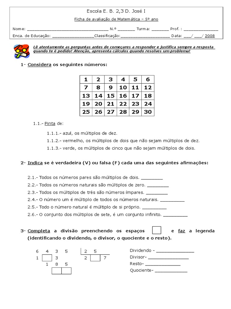 Ficha de avaliao de Matemtica 5 ano