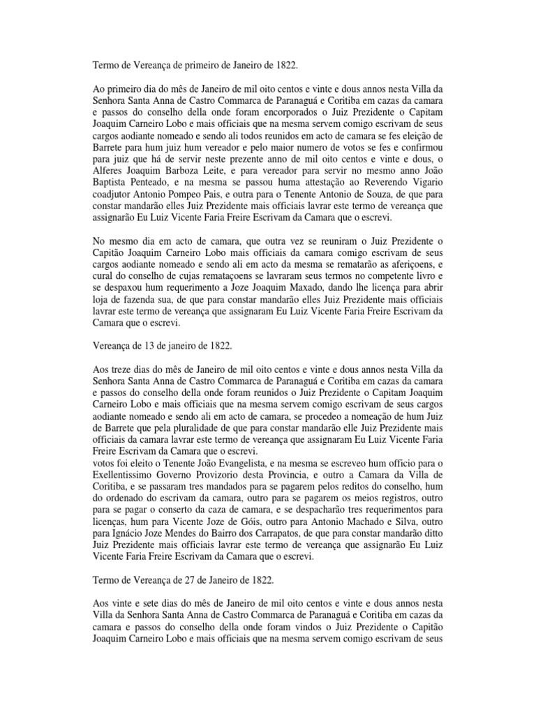Janeiro, hum do Ouvidor da comarca, hum do Prezidente da Camara de Coritiba, e se