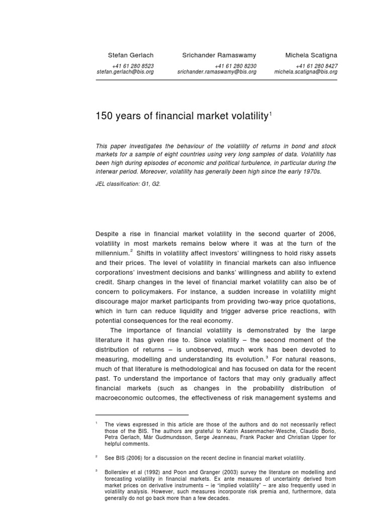 developments in market liquidity), it is of interest to investigate the behaviour of volatility over very long time spans and across a wide range of financial markets. While some such studies exist, these tend to focus on individual countries and markets or on specific episodes. 4 To our knowledge, there is no cross-country study of the evolution of volatility for a range of financial markets and instruments over an extended period of time. This article uses extremely long time series of monthly bond and stock returns to document the evolution of the volatility of returns in Australia, Canada, France, Germany, Italy, Japan, the United Kingdom and the United States. Depending on the country, the data start as early as 1850; all data end in 2005. We also discuss how the volatilities are linked to macroeconomic conditions. While it would have been interesting to also investigate the volatility of short-term interest rates and exchange rates, the data in many cases display little, if any, variation. Thus, short-term interest rates are typically closely tied to interest rates set by central banks, which in many historical episodes were fixed for long periods of time. Similarly, many bilateral exchange rates were fixed during extended time spans as a consequence of the operation of the gold standard or the Bretton Woods system. For this reason, we focus here on the volatility of stock and bond returns. While the purpose of the study is merely to describe the evolution of