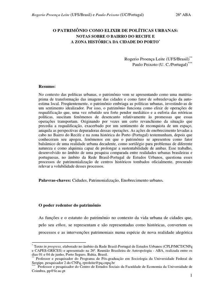 Palavras-chaves: Cidades, Patrimonializao, Enobrecimento urbano.